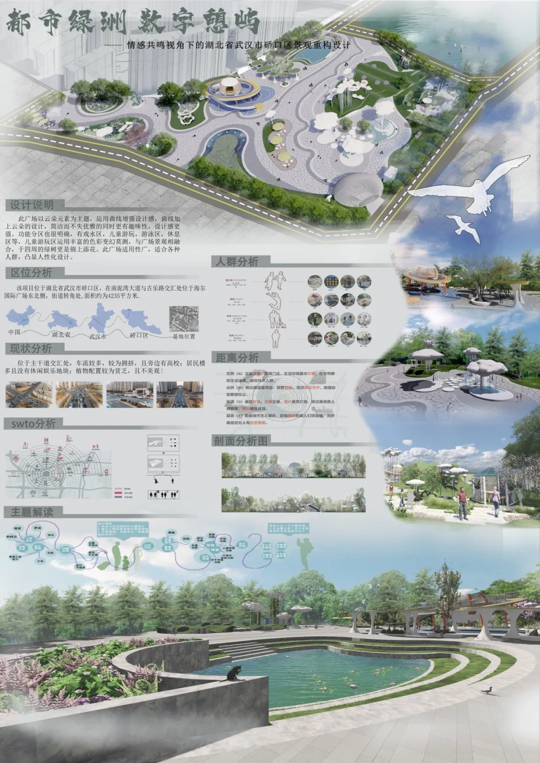 本设计以“都市绿洲 数字憩屿”为主题。设计运用曲线营造灵动云态,借镜面装置打造虚实交融、四季有景的空间,布局兼顾功能与美观,以色彩渐变绿植营造诗意休憩氛围。场地交通便利,能满足不同人群需求。同时,针对现状绿植不足的问题,设计优化并融入数字元素,使其成为市民亲近自然、畅享数字生活的城市绿洲,助力提升区域人居品质与活力。