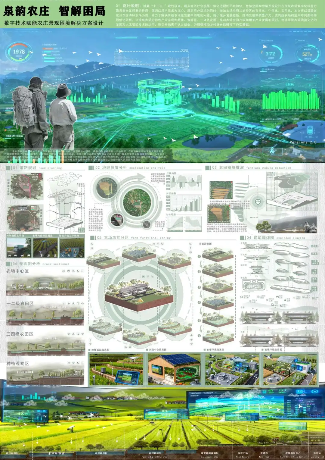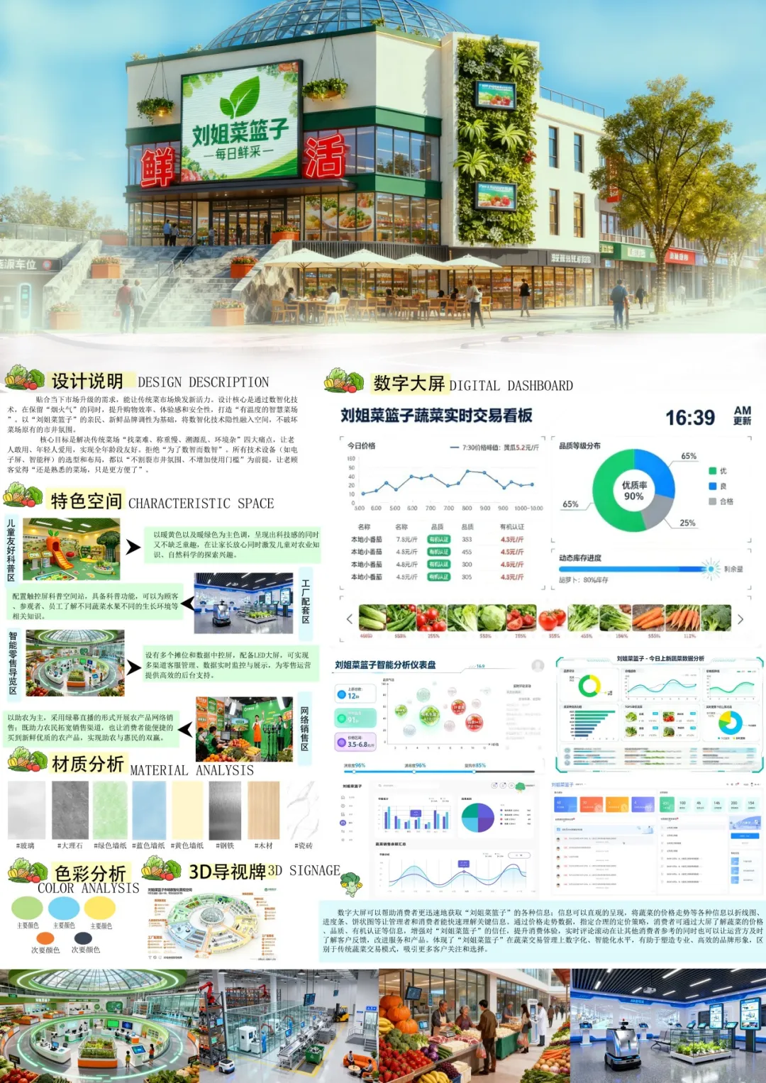 本设计旨在打造集批发交易、加工配套、线上营销、科普体验、客服运营于一体的全链路数智化市场空间,通过环形布局与全息导视系统,实现功能分区清晰化、运营流程可视化、用户体验智能化,成为社区农产品数智化服务的标杆场景。同时以“社区新鲜蔬菜便民站”为核心,聚焦“新鲜、实惠、放心”三大关键词,打造适合家庭日常采购,尤其满足家长对儿童健康食材需求的社区蔬菜服务品牌。设计通过空间的数智化重构,不仅解决了传统农产品市场“交易低效、品控模糊、体验单一”的痛点,更为社区农产品服务的升级提供了可复制的空间范式。