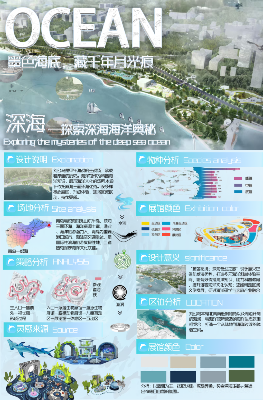 设计围绕“深海生物科普”构建了线上线下一体化的多维度设计体系。线下海洋馆以流线型建筑模拟深海生物形态,通过文创区、浮游/底栖生物展馆等分区,结合深海生命链可视化装置、全息投影等技术,打造沉浸式生态体验;线上“探秘指尖深海APP”以蓝色系界面、海洋元素图标构建视觉语言,实现智能导览、模拟深潜游戏等功能,打破时空限制。同时,通过数据可视化大屏呈现深海生物动态、客流及生态变化,系列海报以复古半调风格强化海洋美学,最终形成“空间沉浸+数字交互+数据驱动+文化传播”的闭环,助力深海知识普及与海洋保护意识觉醒。