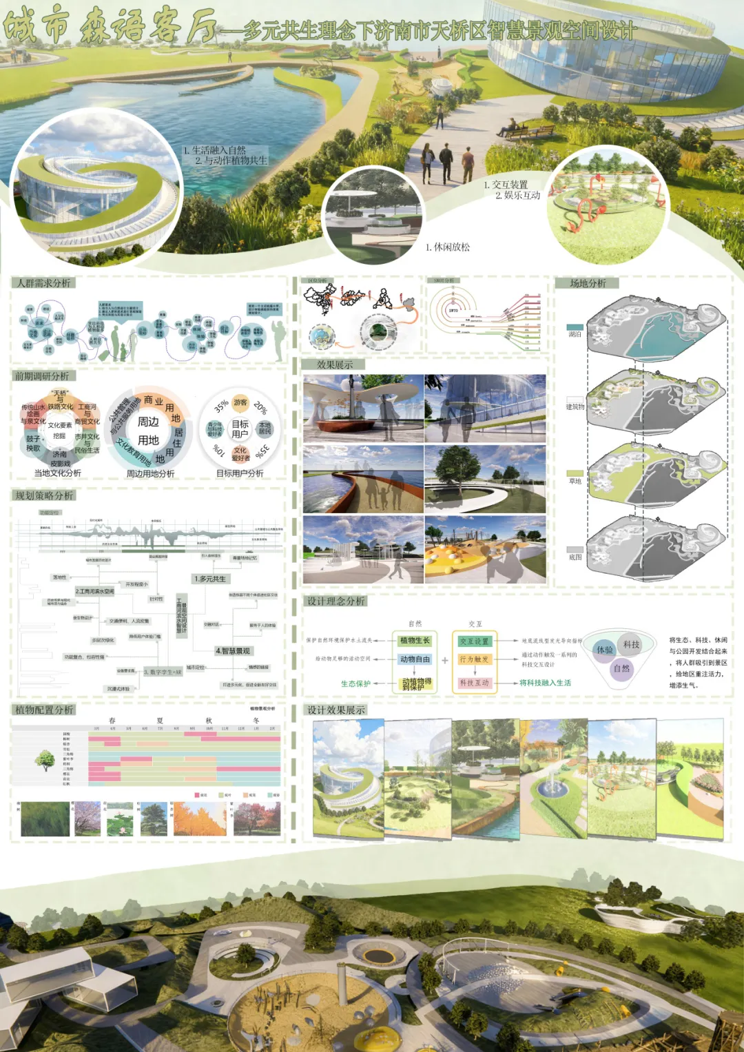 本案以天桥区核心留白地为载体,锚定生态保护与城市更新需求,以“森语”为魂,融“多元共生”理念与智慧技术,构生态、功能、人文三位一体城市客厅,恪守“生态优先、智慧赋能、以人为本、文化传承”原则。创意深植济南提炼本土元素为场地符号,依“森之语-城之韵-人之乐”逻辑,规划滨水景观、儿童娱乐、绿色办公、智慧交互、生态涵养五大区。滨水造“生态缓冲+智慧亲水”空间,儿童区设“森林冒险、科普启蒙、亲子协作”板块,办公区建“林下办公+共享创客”场景,交互区配动态广场与文化长廊;借步道、绿道串联交通,辅生态修复策略,为城市更新提供范式。