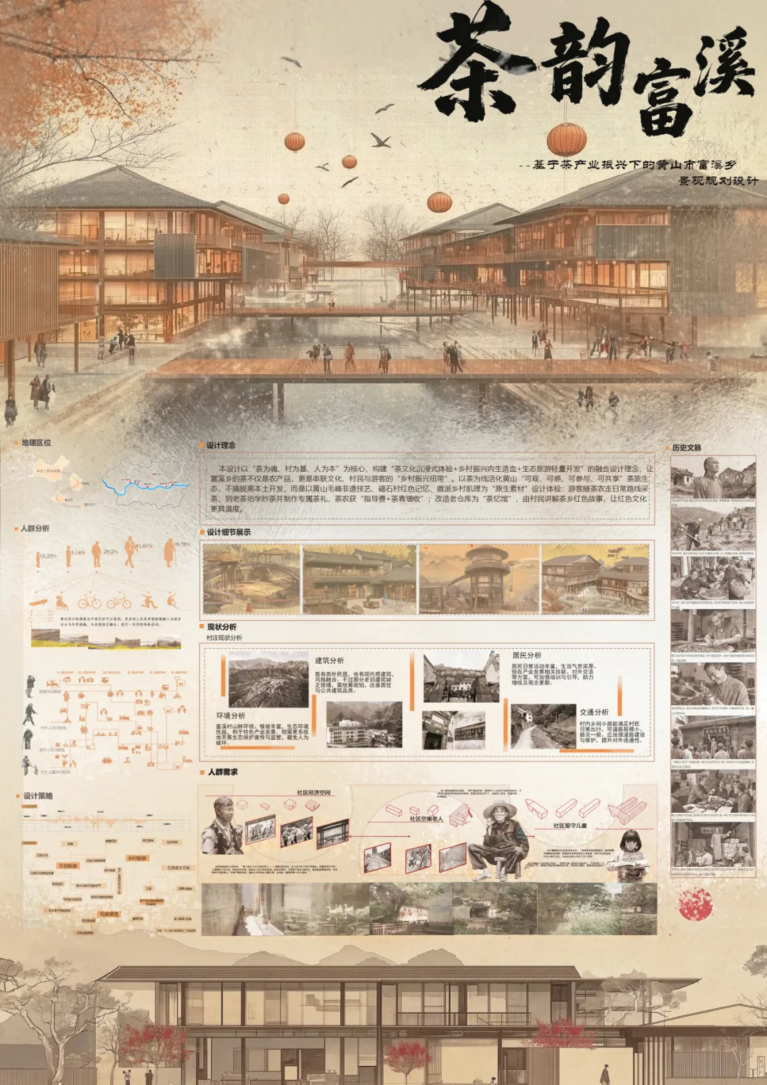 本设计聚焦黄山市富溪乡,以“茶为魂、村为基、人为本”为核心,秉持“茶文化沉浸式体验+乡村振兴内生造血+生态旅游轻量化开发”理念。从地理区位、人群、现状等多维度分析,深挖富溪历史文脉,依托黄山毛峰非遗技艺、矿石红色记忆等“原生素材”,打造可赏、可感、可参与、可共享的茶旅生态。规划茶韵文创研发空间、茗香手作体验工坊等节点,改造老仓库为“茶忆馆”,开展专属茶礼、茶叙、茶席等活动,让游客深度体验茶文化,同时助力乡村产业振兴与文化传承,实现生态、文化、经济多维度融合发展。