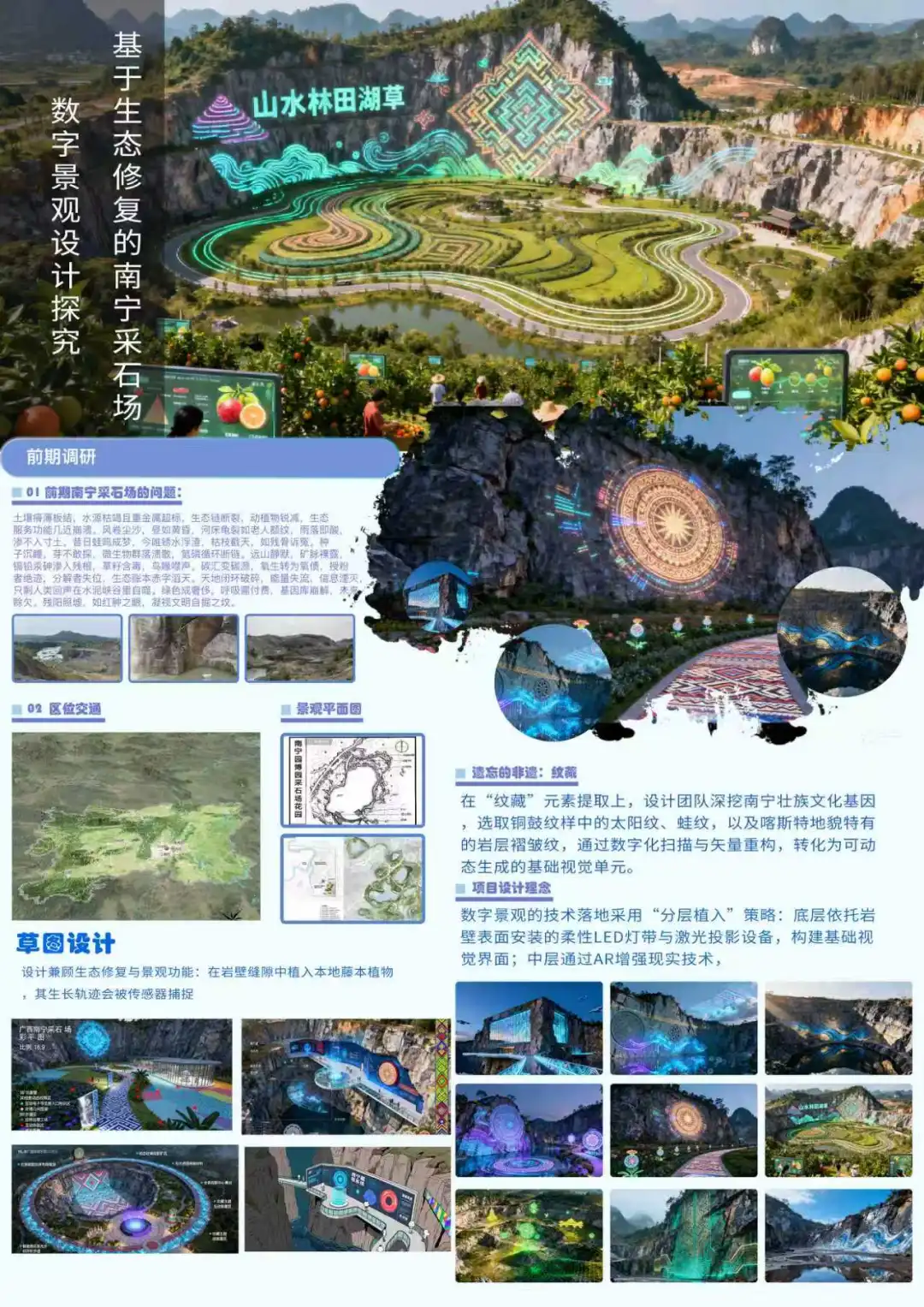 本设计以“唤醒岩壁记忆,重构数字生态”为核心,将地域文化纹样与数字技术深度融合,实现工业遗址的生态修复与文化再生。底层依托岩壁表面安装的柔性LED灯带与激光投影设备,构建基础视觉界面;中层通过AR增强现实技术,游客用手机扫描特定岩壁区域,即可触发纹样背后的文化故事;顶层打造数字孪生系统,将采石场的地形数据、生态修复进度与纹样动态数据实时同步至云端平台,管理者可通过后台调控景观效果,游客也能在线上“云游”采石场,参与纹样DIY设计并同步至线下投影,形成“线上线下联动的文化共创生态”。