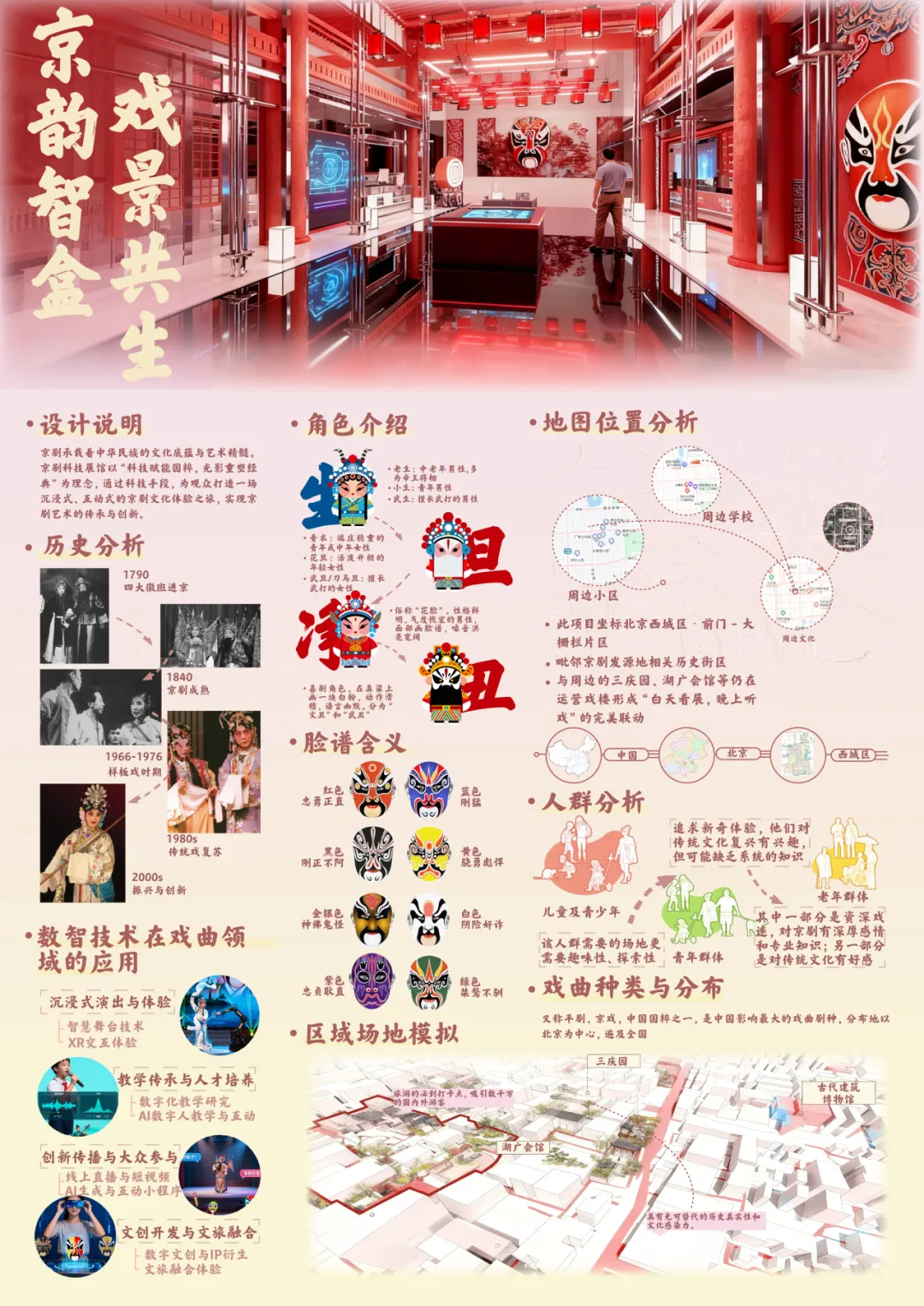本设计以“科技赋能国粹,光影重塑经典”为理念,依托北京西城区前门-大栅栏片区的京剧文化底蕴,融合数智技术打造沉浸式京剧文化体验空间。从历史维度梳理京剧发展脉络,解析生旦净丑角色与脸谱含义,针对儿童及青少年、青年、老年等不同群体需求,构建“惊梦·入戏—解韵·识趣—登台·共演—凝韵·共生”的空间情景序列。运用XR交互、智慧舞台等技术,实现沉浸式演出、数字教学传承、线上传播与文创融合等多维度应用;同时设计IP形象“戏韵玲珑”、专属APP及丰富周边,通过交互游戏与体验区,打破时空界限,让观众在科技与文化的碰撞中,深度感受京剧艺术的传承与创新,实现传统京剧与现代数智技术的共生共荣。