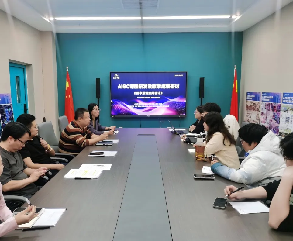 2025年10月22日下午4时,设计学院艺术与科技系在罗马城堡637会议室召开《数字景观空间设计》AIGC课程研发及教学成果研讨会。设计学院副院长孙文琰、艺术与科技系主任宫景政、产品设计系主任田宇、设计艺术系主任邵建明、艺术与科技专业各教研室主任及本学期该课程全体任课教师参会,共同聚焦课程创新成果,探讨AI赋能艺术设计教学的深化路径。
